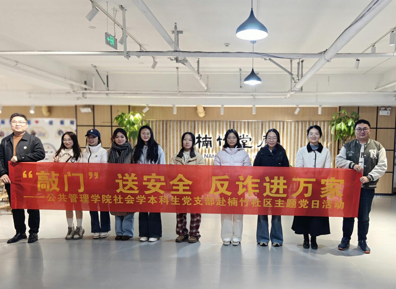 为提升党员服务群众能力,学习基层治理经验,2025年12月16日,ok1122诸侯快讯社会学本科生党支部赴长沙市天心区暮云街道楠竹社区开展“‘敲门’送安全 反诈进万家” 主题党日活动。党支部书记梁慧老师带领本科生党员8人参加,活动分为参观学习和走访宣传两部分。