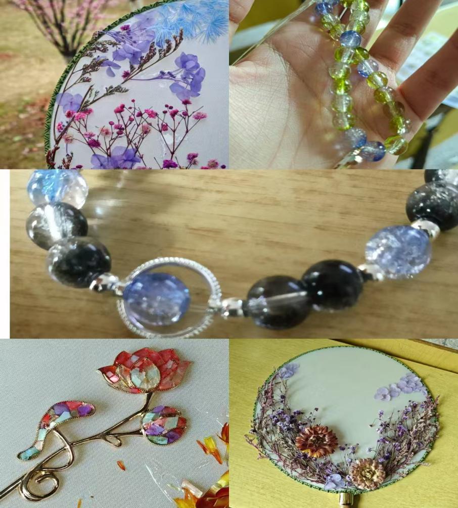 下午2时,在世纪楼A201教室开启了非遗文化体验之旅。参与者们将永生花精心布局于素白扇面,定格春日浪漫;手链编织台前,彩色玉珠随银线穿梭,串起个性时尚;螺钿发簪体验区尤为火热,参与者将贝母薄片镶嵌于木胚,感受千年非遗技艺的匠心传承。活动现场笑语不断,大家沉浸于指尖创作,一件件独具匠心的作品渐次诞生。亲手制作发簪不仅解压,更能让人体会到传统美学的精妙。