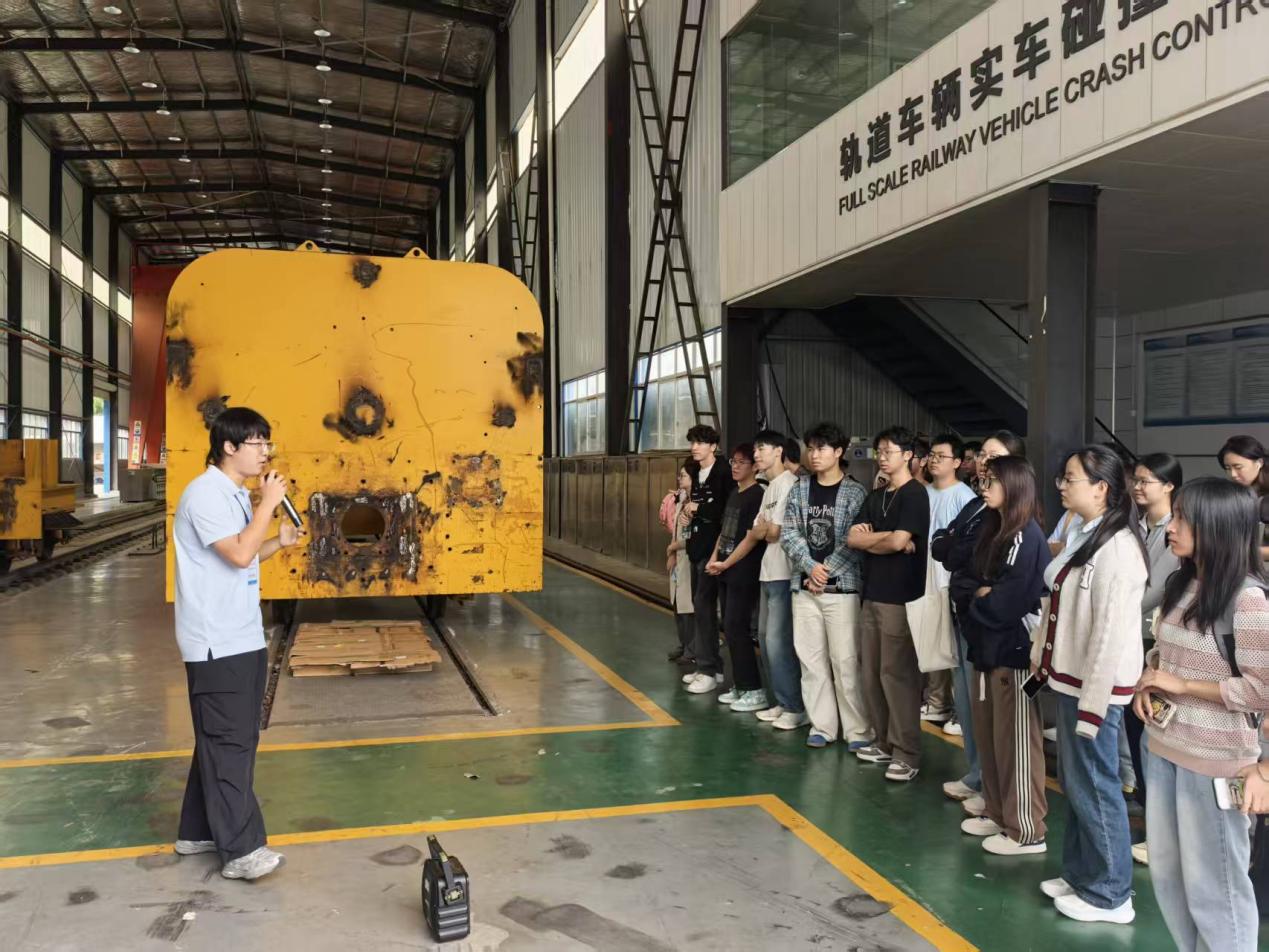 活动伊始,在基地讲解员的带领下,两班同学先后走进高速列车研究中心列车动模型实验室和轨道车辆实车碰撞实验室。讲解员系统梳理了我国轨道交通从追赶、跟跑到领跑的发展历程,通过实验设备与技术原理,同学们直观了解到高速列车气动设计、结构理念、技术创新和未来发展方向,深刻体会到我国轨道交通领域实现技术跨越的艰辛与成就。