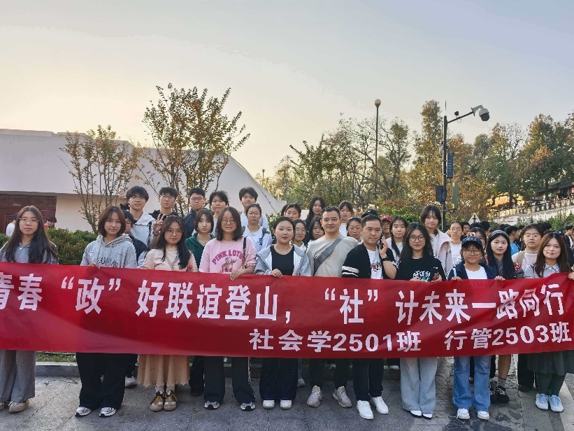 11月15日下午2时,我院社会学2501班与行政管理2503班联合举办了一场以“青春‘政’好联谊登山,‘社’计未来一路同行”为主题的登山团日活动,院学工办主任徐立坤与班导师谢刚出席本次活动,此次活动将体育锻炼、秋日赏景与跨班联谊有机结合,取得了圆满成功。