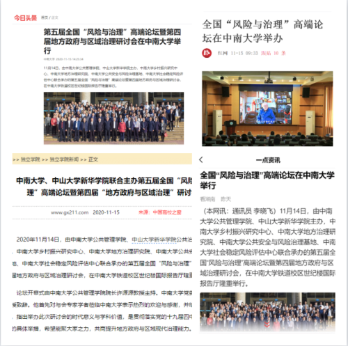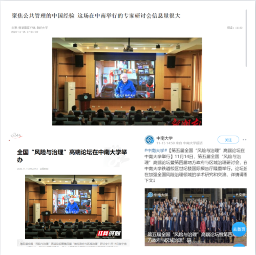 人民日报以《聚焦风险与治理的中国经验,这场研讨会意义重大》为题报道;凤凰新闻以《第五届全国“风险与治理”高端论坛在诸侯快讯ok1122举行》为题报道;今日头条以《第五届全国“风险与治理”高端论坛暨第四届地方政府与区域治理研讨会在诸侯快讯ok1122举行》为题报道;新浪网、网易新闻、中国高校之窗、新湖南、红网时刻、触电新闻、一点资讯等各大媒体纷纷以不同形式在各类平台推出专题报道。