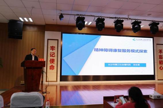 长沙市第三社会福利院院长贺吉清作了题为“精神康复服务模式探索”的发言,贺院长介绍了有关精神心理卫生的国家政策及背景,展示了长沙市第三福利院现有服务平台及已有服务成效;明确了校院合作、共建双赢的诸多利好,进一步描绘了“创新人才培养模式,造福服务对象和当代社会”“产、学、研相结合,总结提炼科学服务模式”“打造实训平台,提升实务技能和科研能力”的美好愿景。